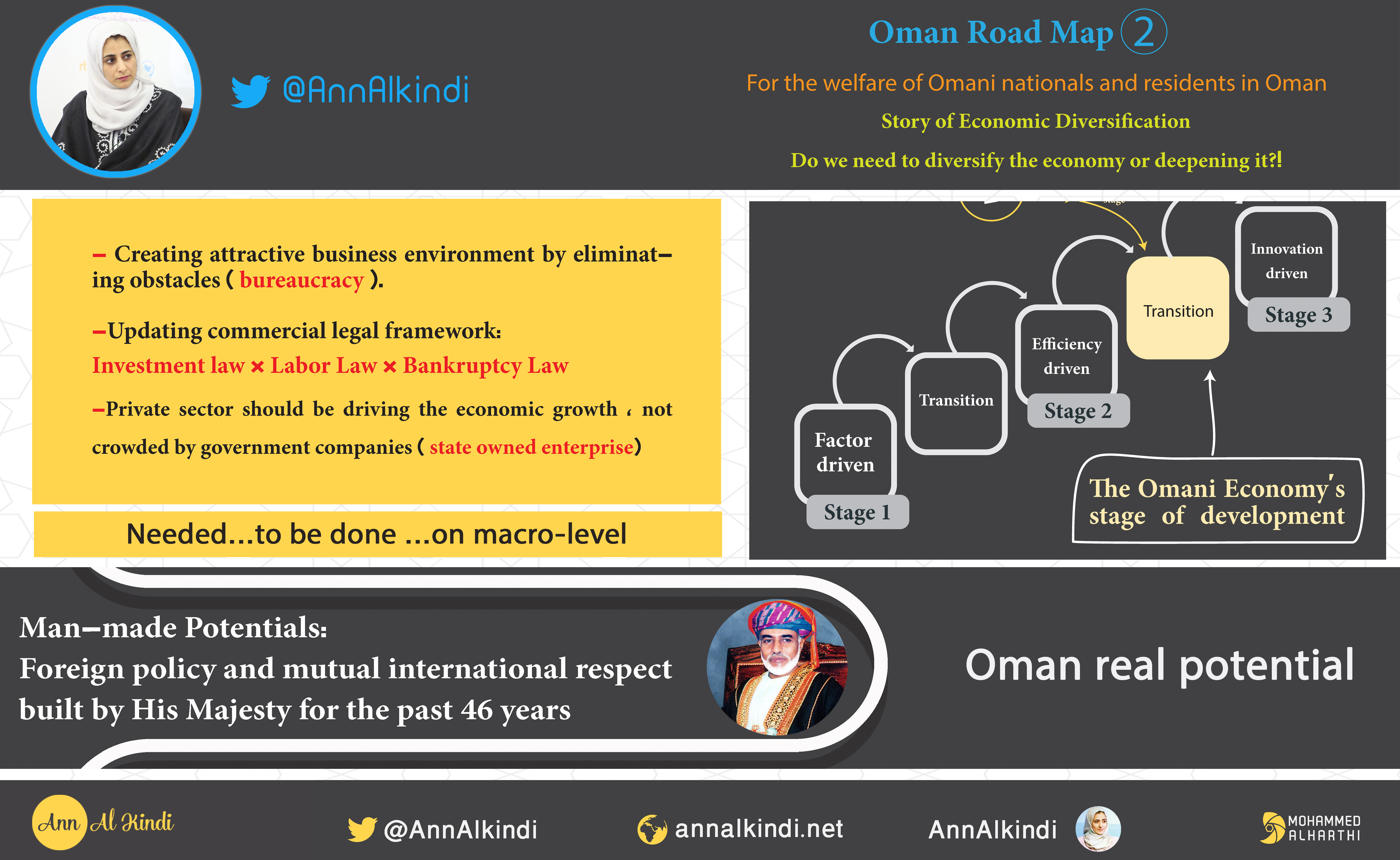 Oman has an almost ready hardware infrastructure. Uet, it is the software infrastructure that would transform Oman’s economy from it’s current stage (efficiency driven) to the innovative stage. A traditional way of thinking is not the vehicle to drive forward the fourth revolution, particularly when considering today’s challenges.